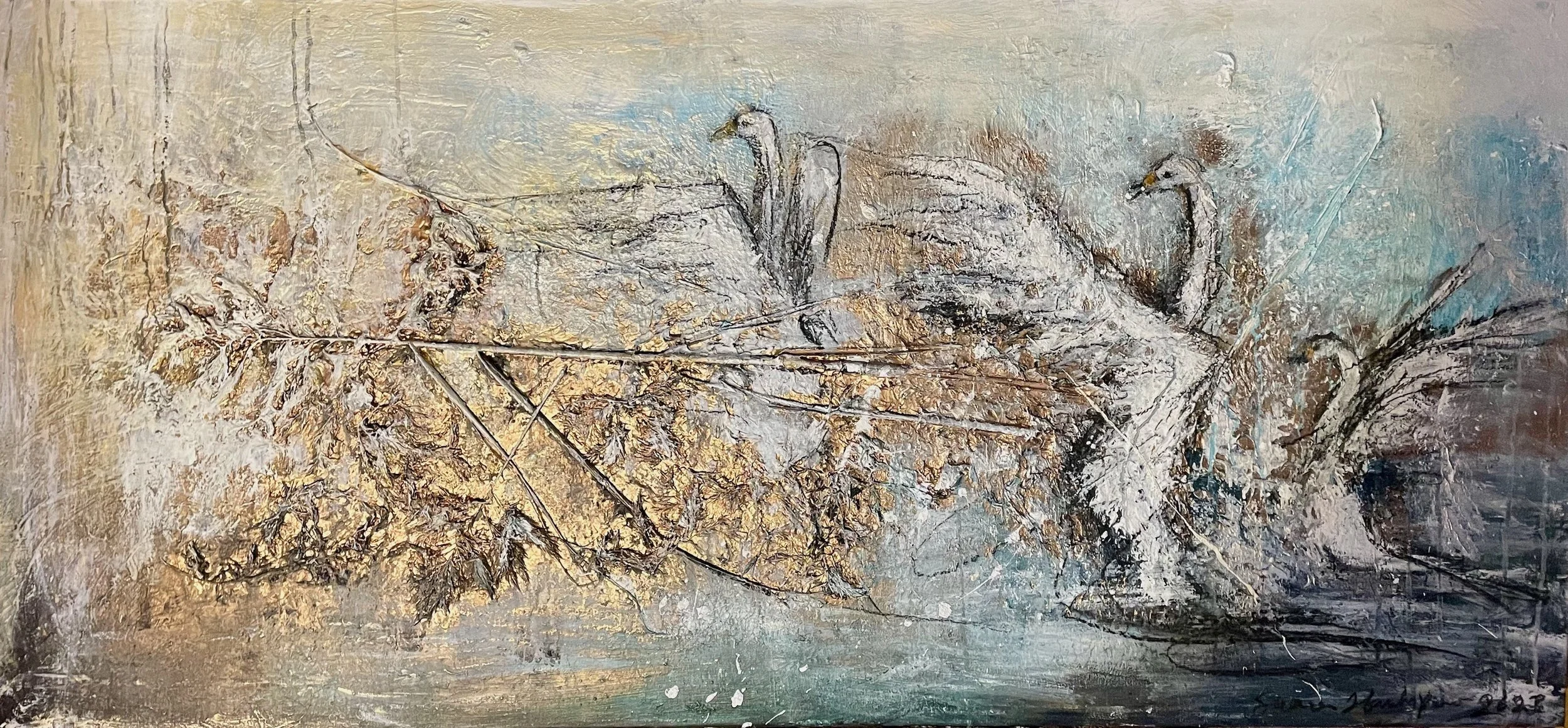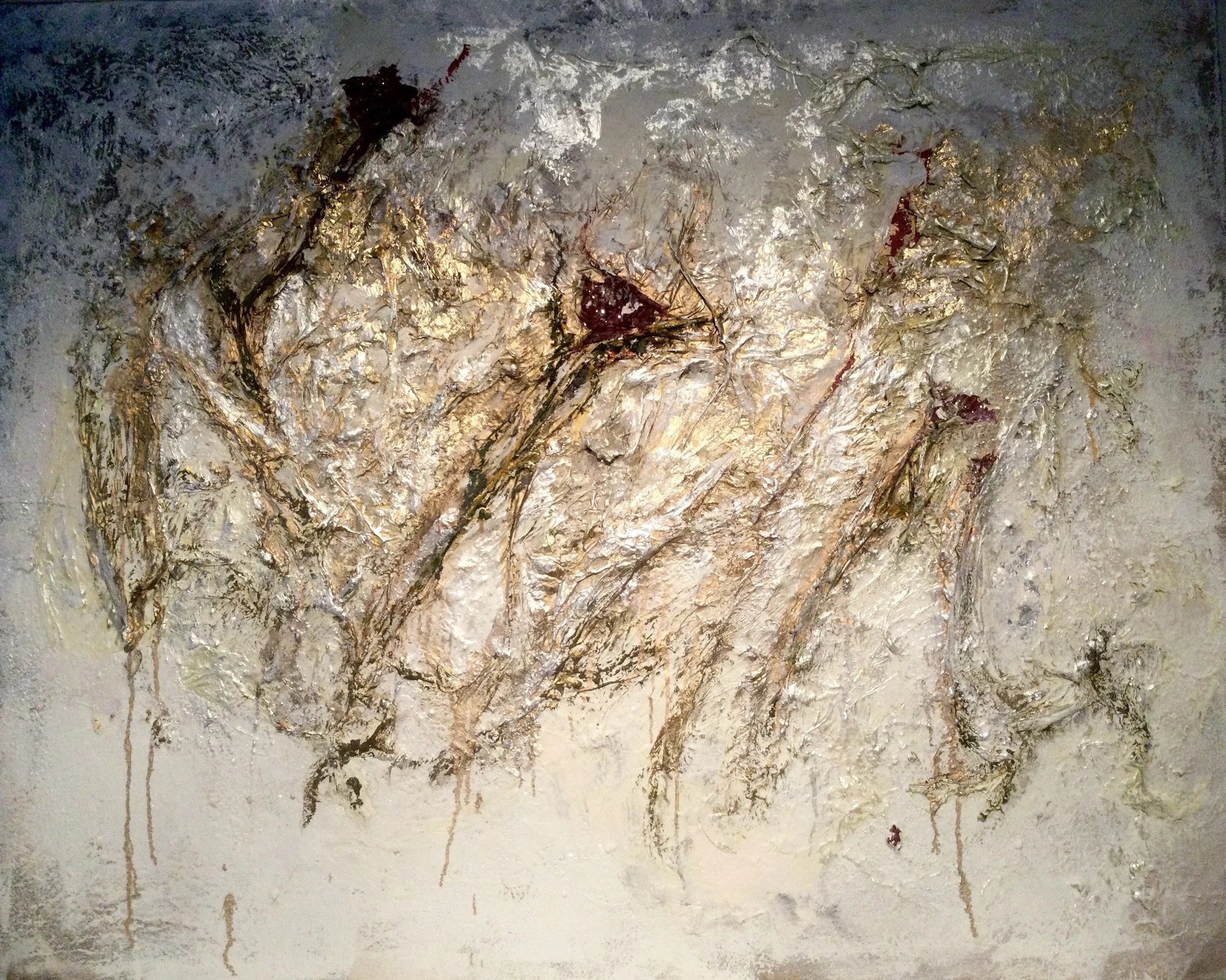 Olen käyttänyt maalausteni pohjina paljon luonnonmateriaaleja kuten ruusuja, rantaheinää ja eucalyptusta yhdistettynä pohjamassaan ja sellakkaan. Näin syntyy kaaosmainen ja kolmiulotteinen alusta varsinaiselle värimaailmalle. Pyrin luomaan teokseni syviksi erilaisten värikerrosten kautta.